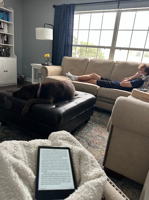 Sitting in my favorite chair under my favorite blanket reading while Bean recovers from his wisdom teeth removal on the couch next to me.